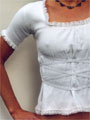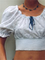 Dirndlbluse aus Baumwolle/Leinen mit elastischer Schnürung und Spitzenborte. DM 270,-
